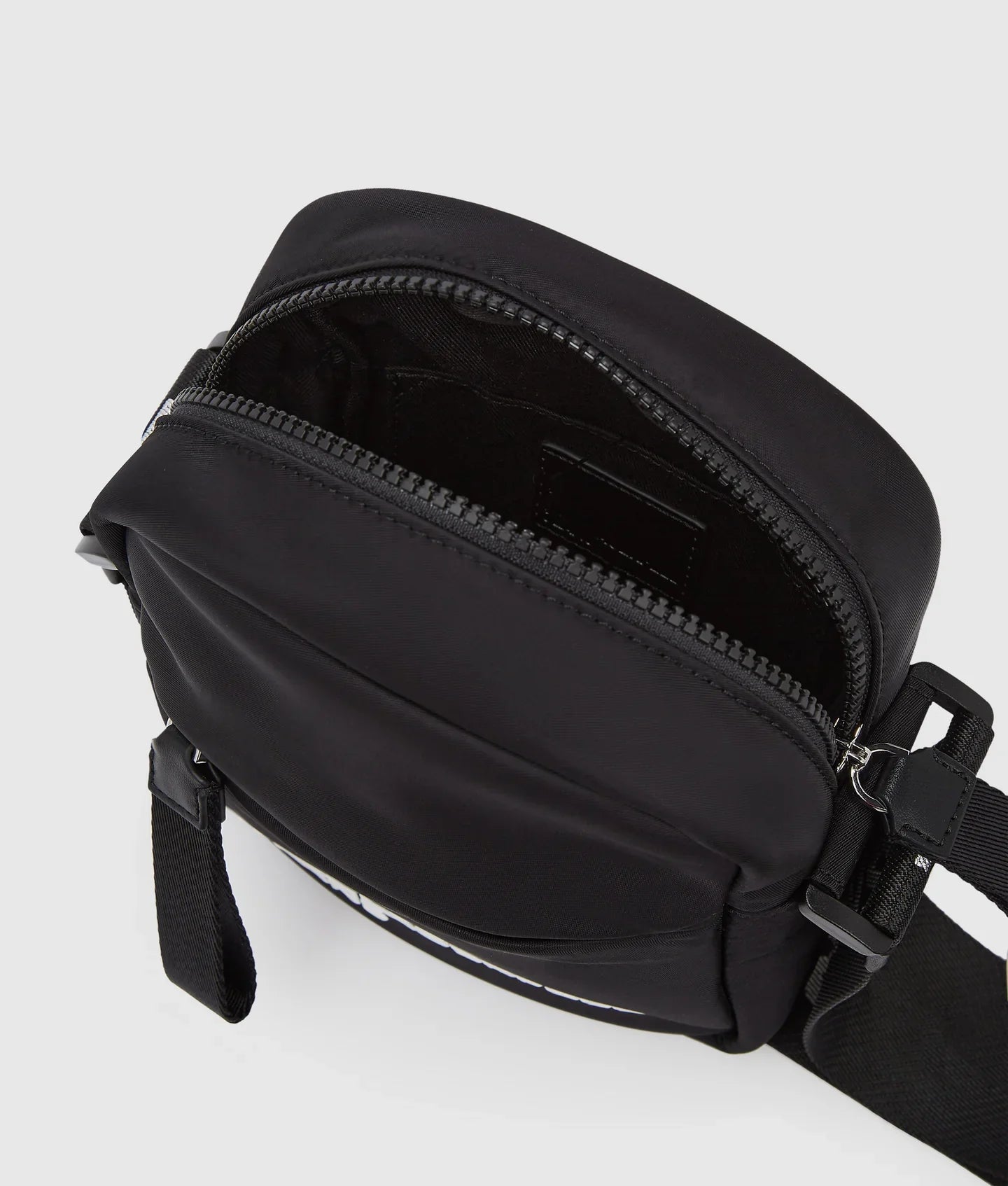 This sleek crossbody bag is an essential companion for on-the-go days. The zip-top closure and concealed front pocket keep essentials and the adjustable webbing strap showcases bold logo detailing for statement-making style.