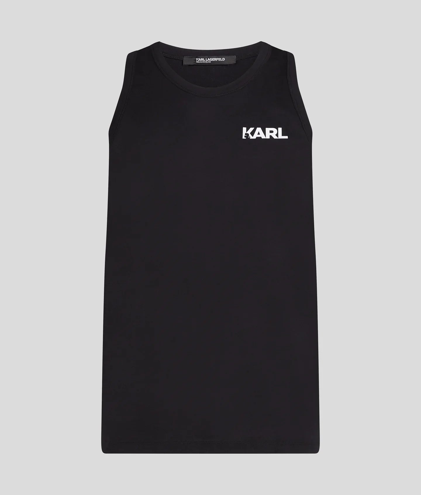 An ultra-lightweight beach tank top featuring a comfortable sleeveless design and a classic crew neck. The prominent KARL logo at the chest adds a statement touch, perfect for sunny days by the water.
