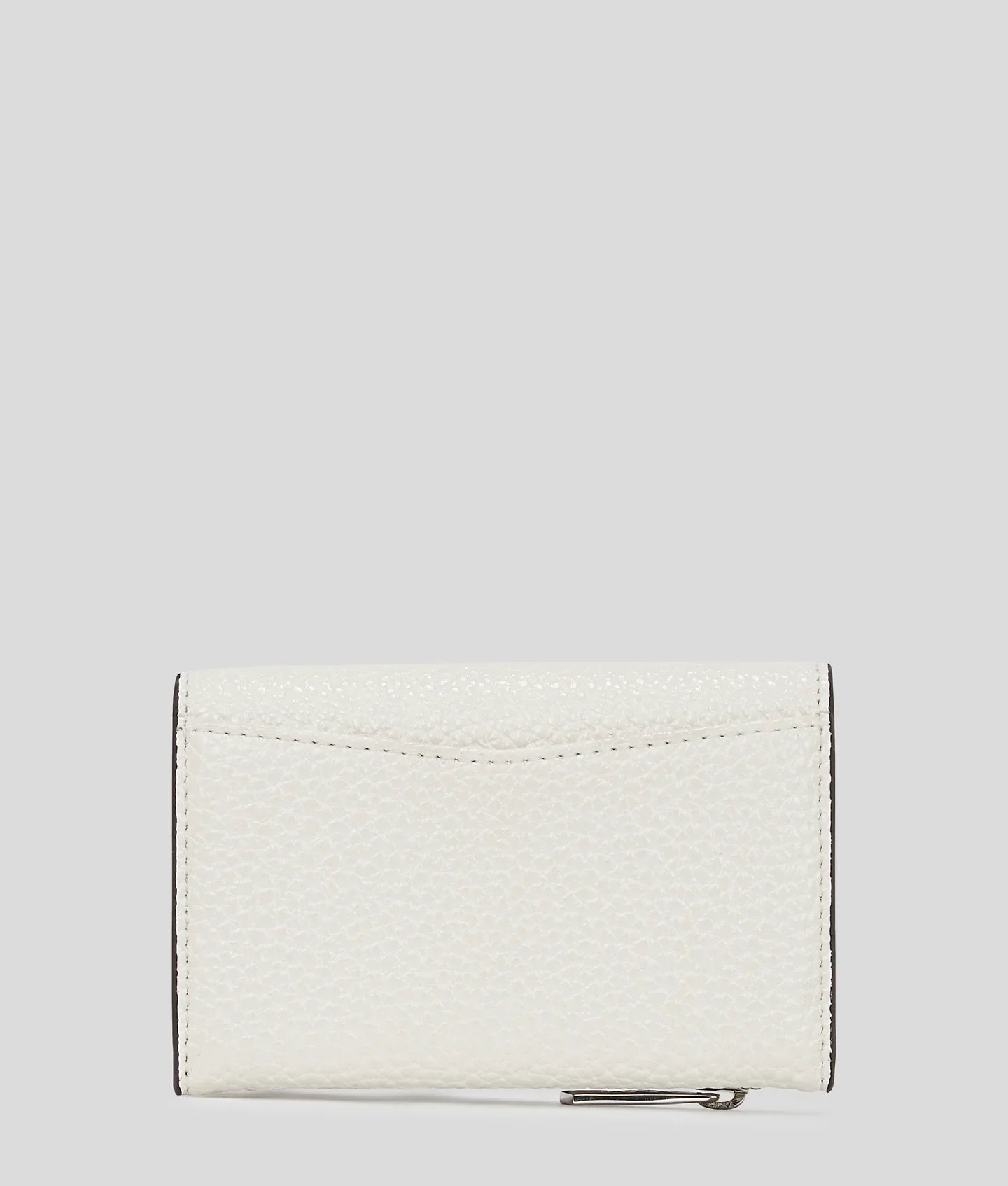 Introducing a petite bifold wallet that effortlessly combines style and functionality. It features a secure button closure, a zipped compartment and multiple card slots. Adorned with 3D Karl Signature artwork, it’s a statement accessory for any occasion.