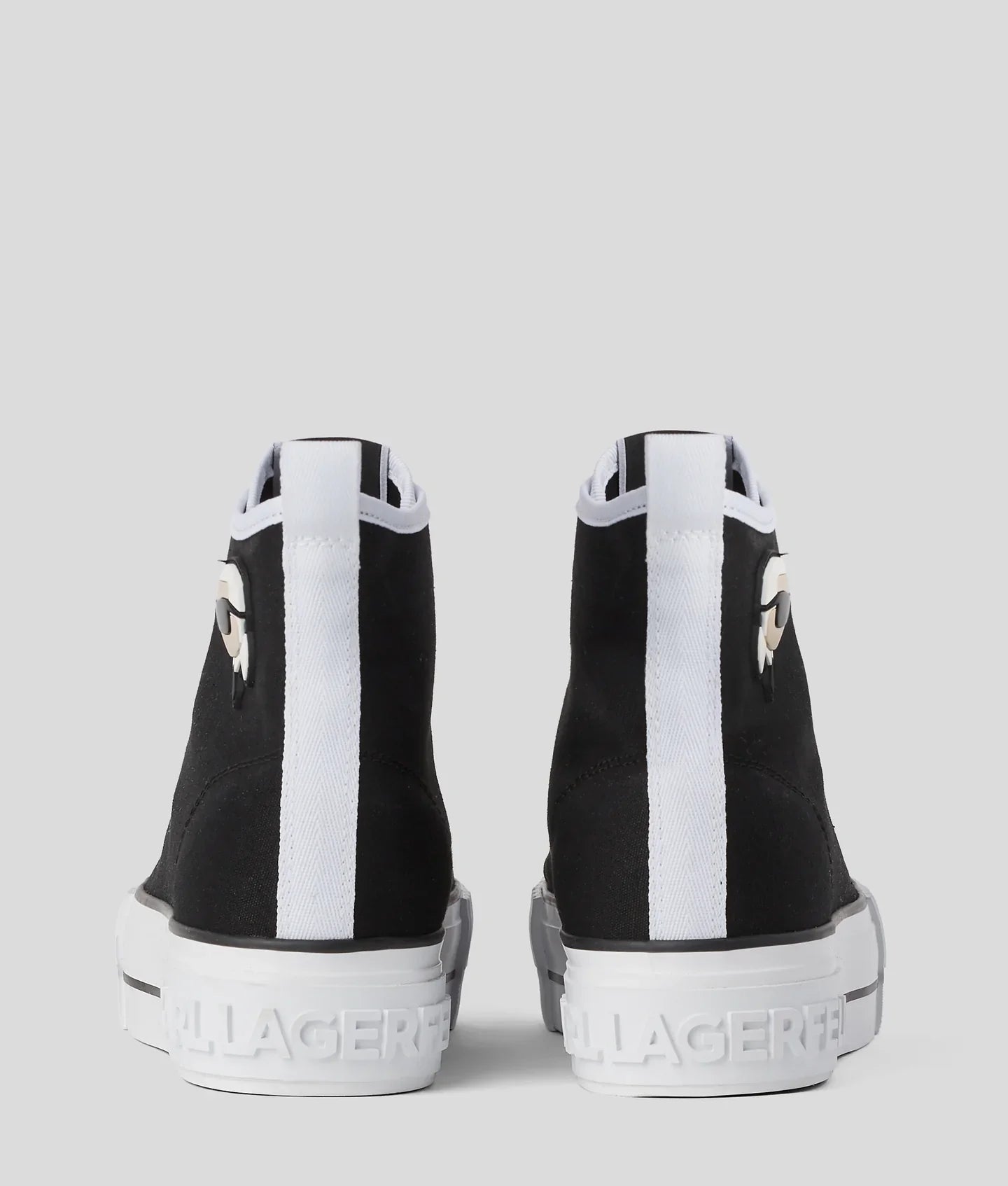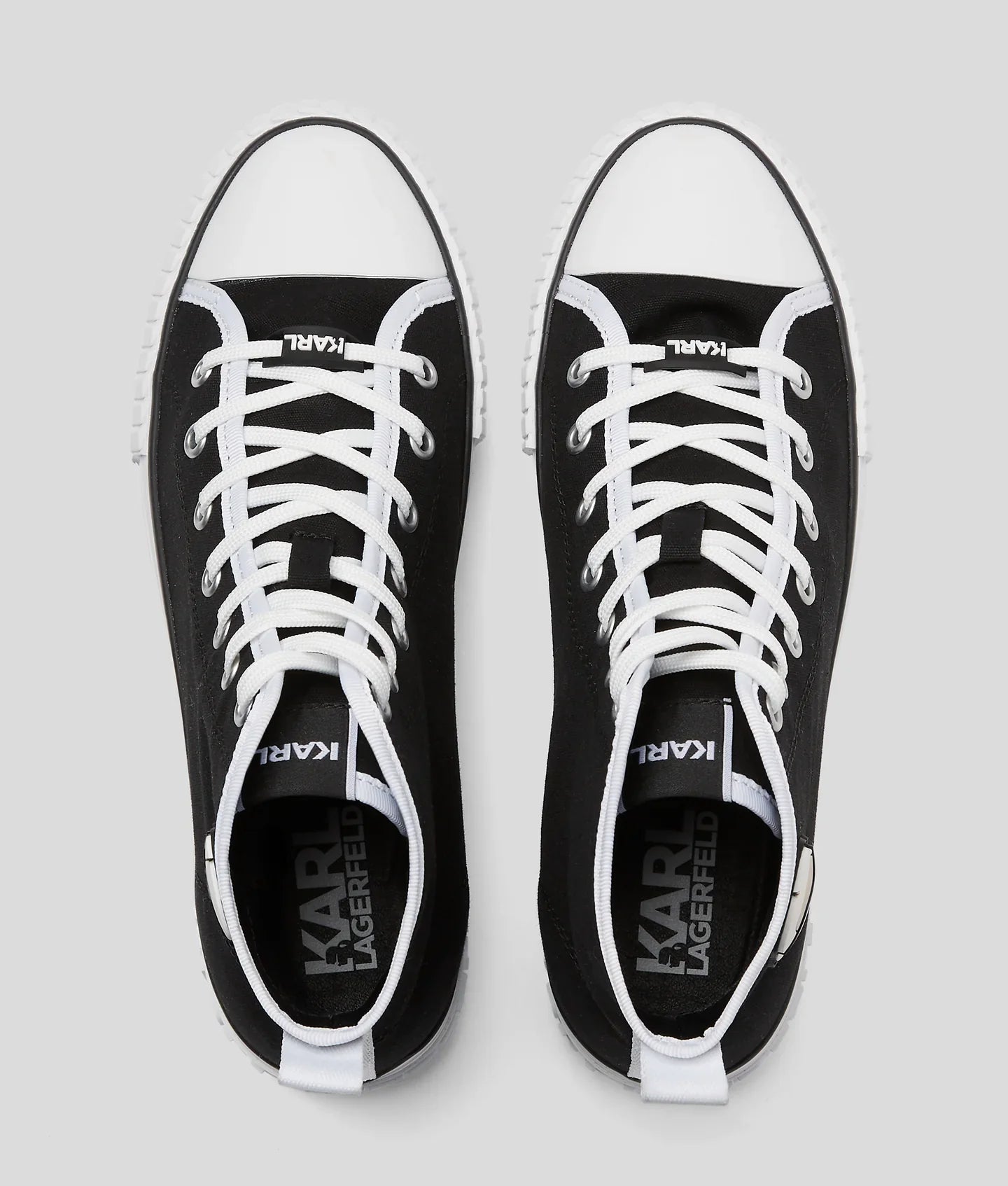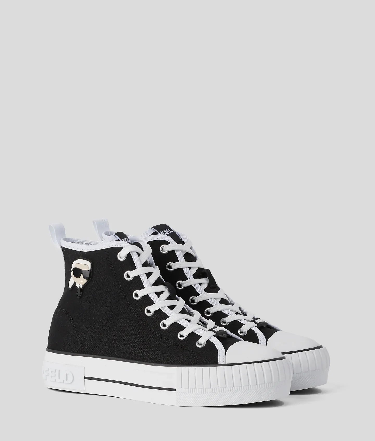 Crafted from Italian canvas, this KARL LAGERFELD high-top, graced with a distinctive NFT rubber dome patch, offers a lace-up design that complements its bold plateau midsole, ensuring an unmistakable fusion of comfort and avant-garde style.