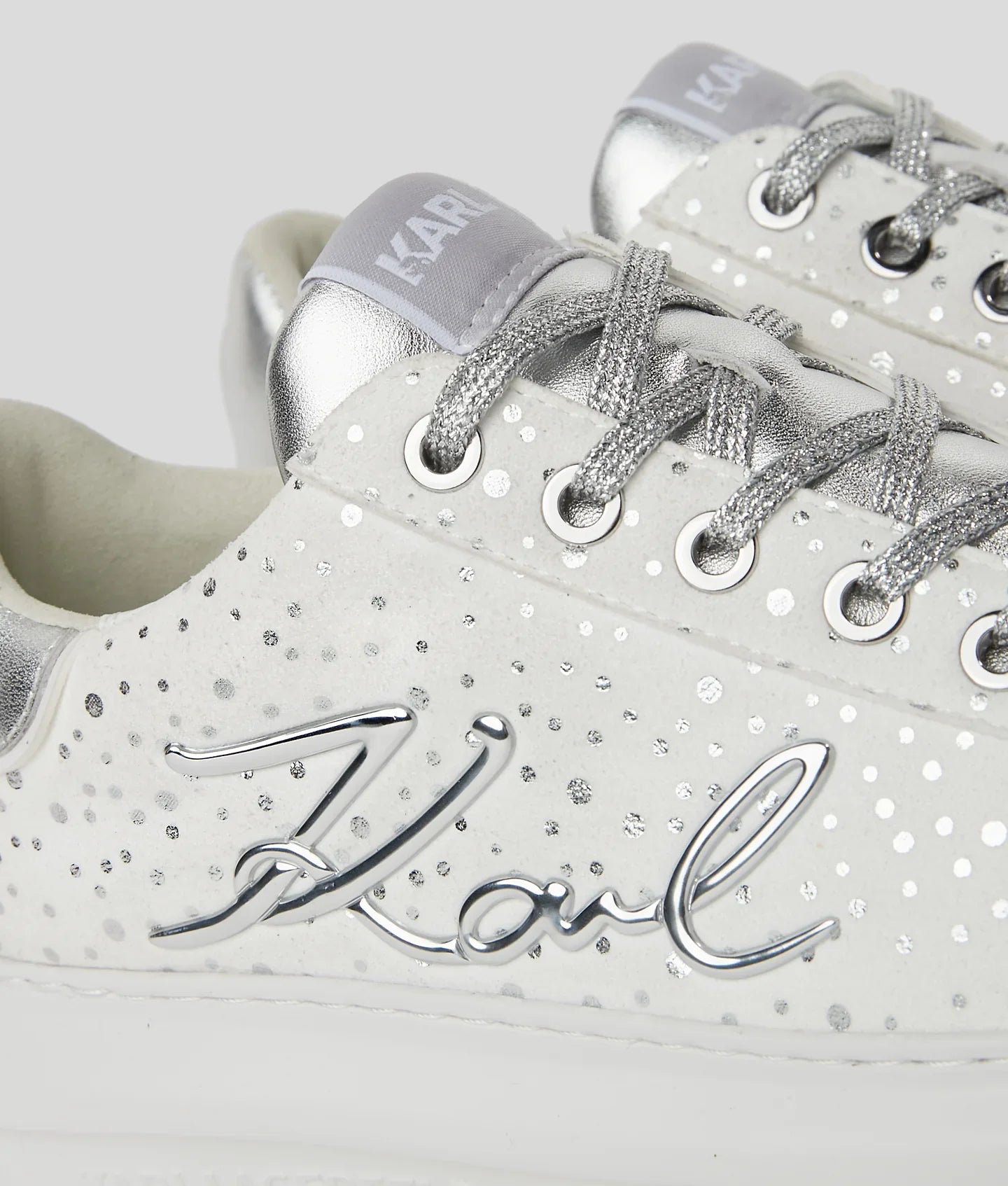Add a touch of sparkle to any outfit with these eye-catching sneakers featuring all-over glittering embellishments. Anchored by a high-shine contrasting heel counter and bold KARL Signature artwork at the side, they are the perfect blend of glamor and comfort.
