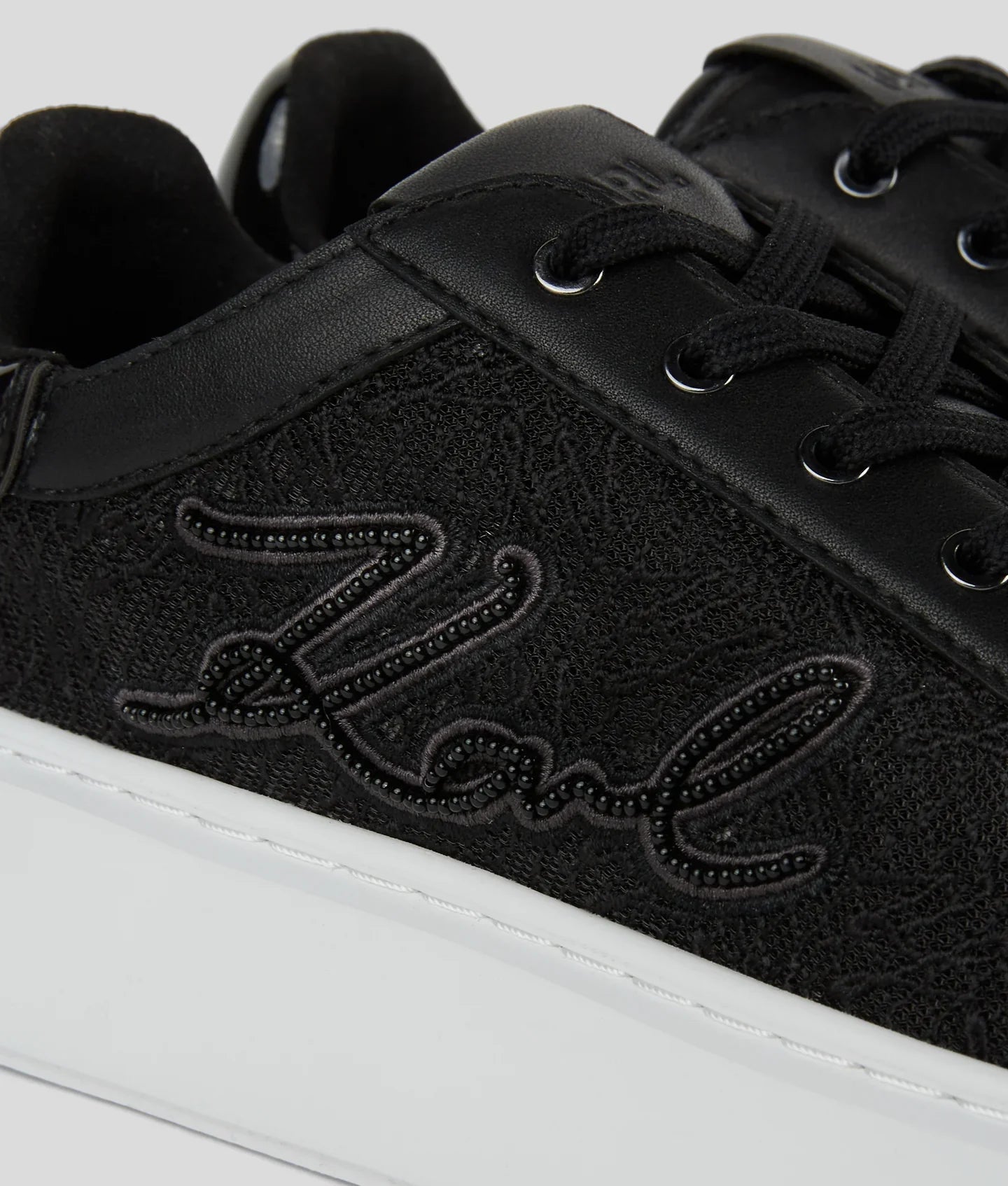 Upgrade your style with these head-turning sneakers, featuring a multi-textured leather upper and a standout wedge sole. Decorated with the iconic KARL Autograph on the laces and beaded KARL Signature artwork, these sneakers make a statement with every step.
