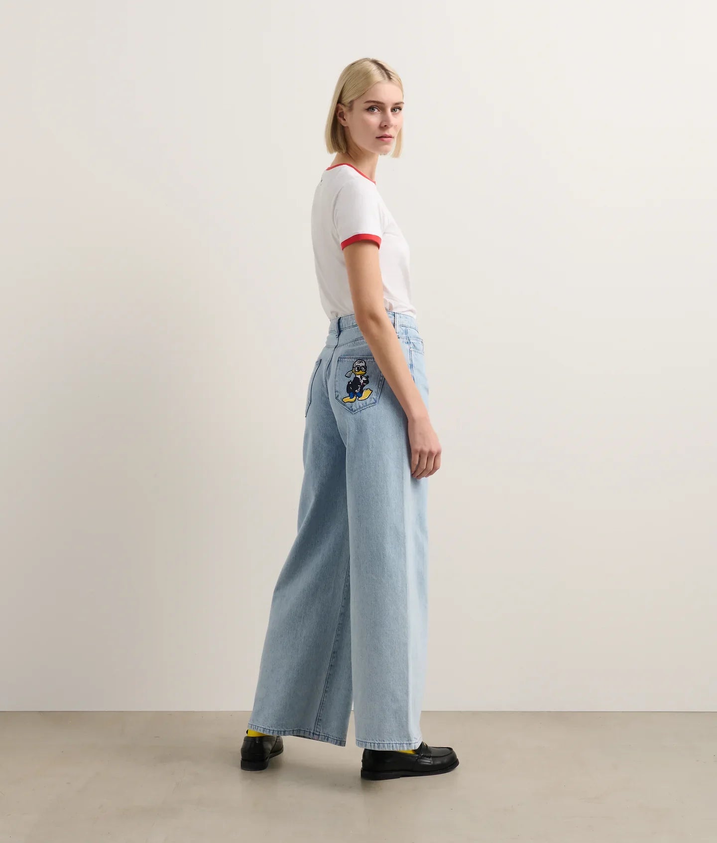Give your everyday wardrobe a playful twist with these wide leg jeans, part of the Disney x KARL LAGERFELD collection. The left leg is adorned with contrasting collaboration embroidery, while the back left pocket is embellished with archival artwork. With a classic zip-fly closure and traditional five pocket construction, they offer timeless style with unique details.