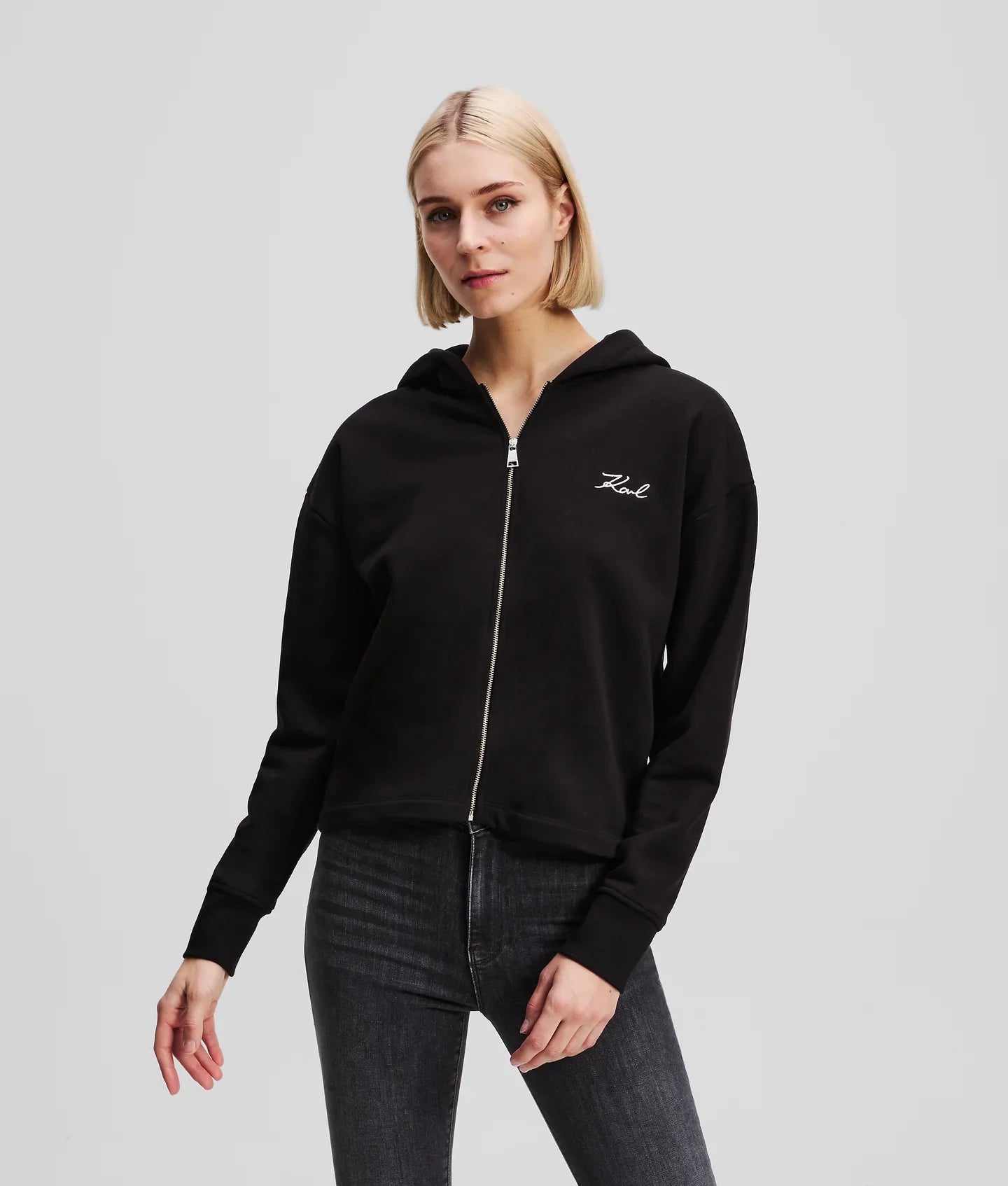 A modern twist on a casual staple, this zip-up hoodie features a slightly cropped silhouette and bold Karl Signature embroidery at the back hem. Minimalist branding at the chest keeps it chic and a zip-front closure with a branded puller offers easy layering.